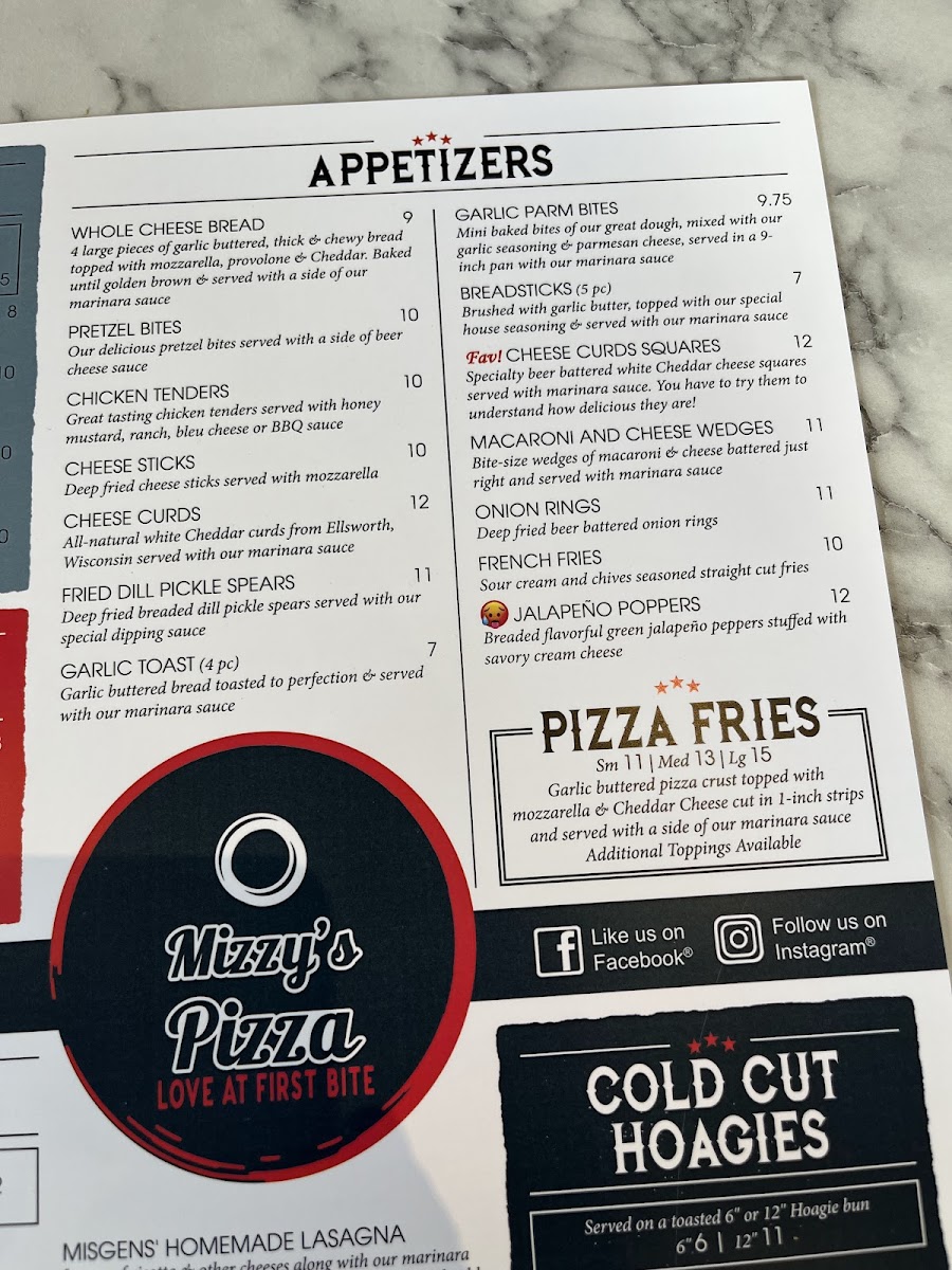 The menu at Mizzy's Pizza - Carver offers a comforting blend of casual bites and satisfying meals suited for a variety of occasions. Whether you're gathering for a relaxed dinner with family, catching a game with friends, or enjoying a casual night out, the selection balances familiar favorites with some thoughtfully crafted options.